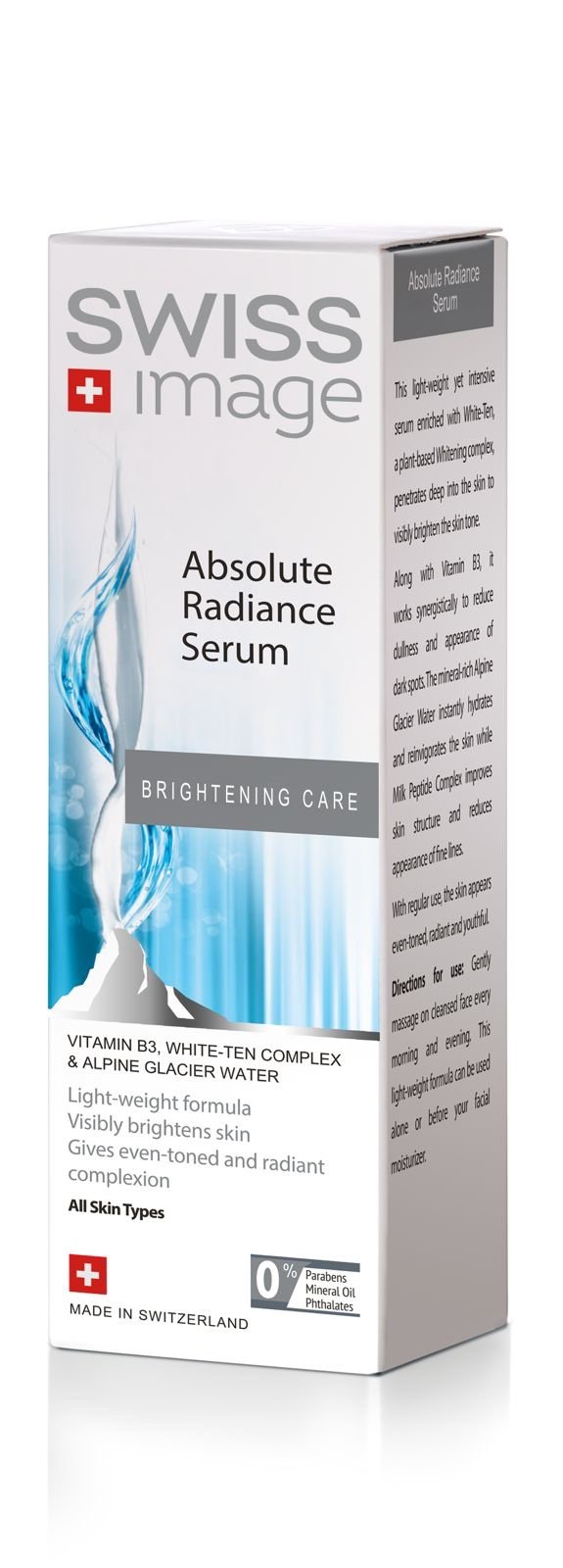- المكونات الأساسية: يحتوي على فيتامين B3 (النياسيناميد) ومركب White-Ten النباتي للتبييض، بالإضافة إلى مياه الأنهار الجليدية في جبال الألب.