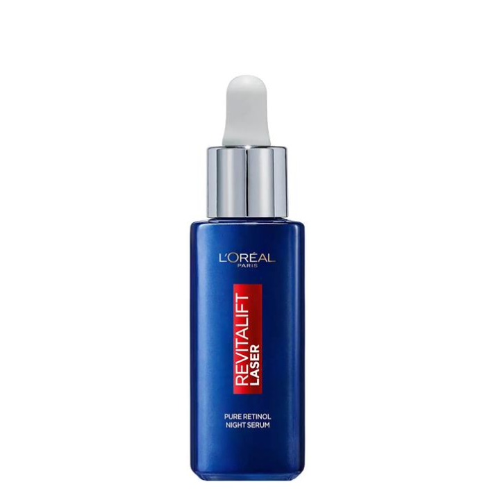 سيروم ريفيتاليفت ليزر بالريتينول النقي بنسبة 0.2% (Revitalift Laser 0.2% Pure Retinol) من لوريال باريس. وهو سيروم ليلي مصمم خصيصاً لمكافحة علامات التقدم في السن واستهداف التجاعيد، حتى العميقة منها.