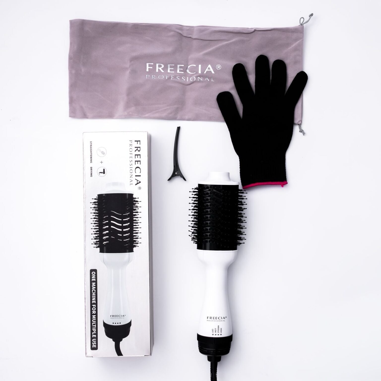 فرشاة الهواء الساخن الاحترافية من فريشيا هي أداة تصفيف شعر متعددة الوظائف تجمع بين التجفيف والتصفيف في خطوة واحدة يمكن استخدامها لتجفيف الشعر الرطب وتنعيمه وإعطائه كثافة (فوليوم) وتصفيفه بسهولة تقنية مزودة بمولد أيونات يطلق أيونات سالبة للمساعدة في تقليل التجعد والكهرباء الساكنة (النفشة) مما يجعل الشعر يبدو أكثر نعومة ولمعاناًسهولة تصميمها المريح والجمع بين الفرشاة ومجفف الشعر يجعلها سهلة الاستخدام وتوفر الوقت والجهد مقارنة بالأدوات المنفصلة تحتوي على إعدادات متعددة للحرارة والسرعة (عادة منخفضة، متوسطة، وعالية) لتناسب أنواع الشعر المختلفة وتفضيلات التصفيف تساعد تقنية توزيع الحرارة المتساوية والطلاء الخزفي (السيراميك) على حماية الشعر من التلف الناتج عن الحرارة المفرطة تأتي الفرشاة عادةً مع حقيبة تخزين أو قفاز حماية من الحرارة كملحقات إضافية.