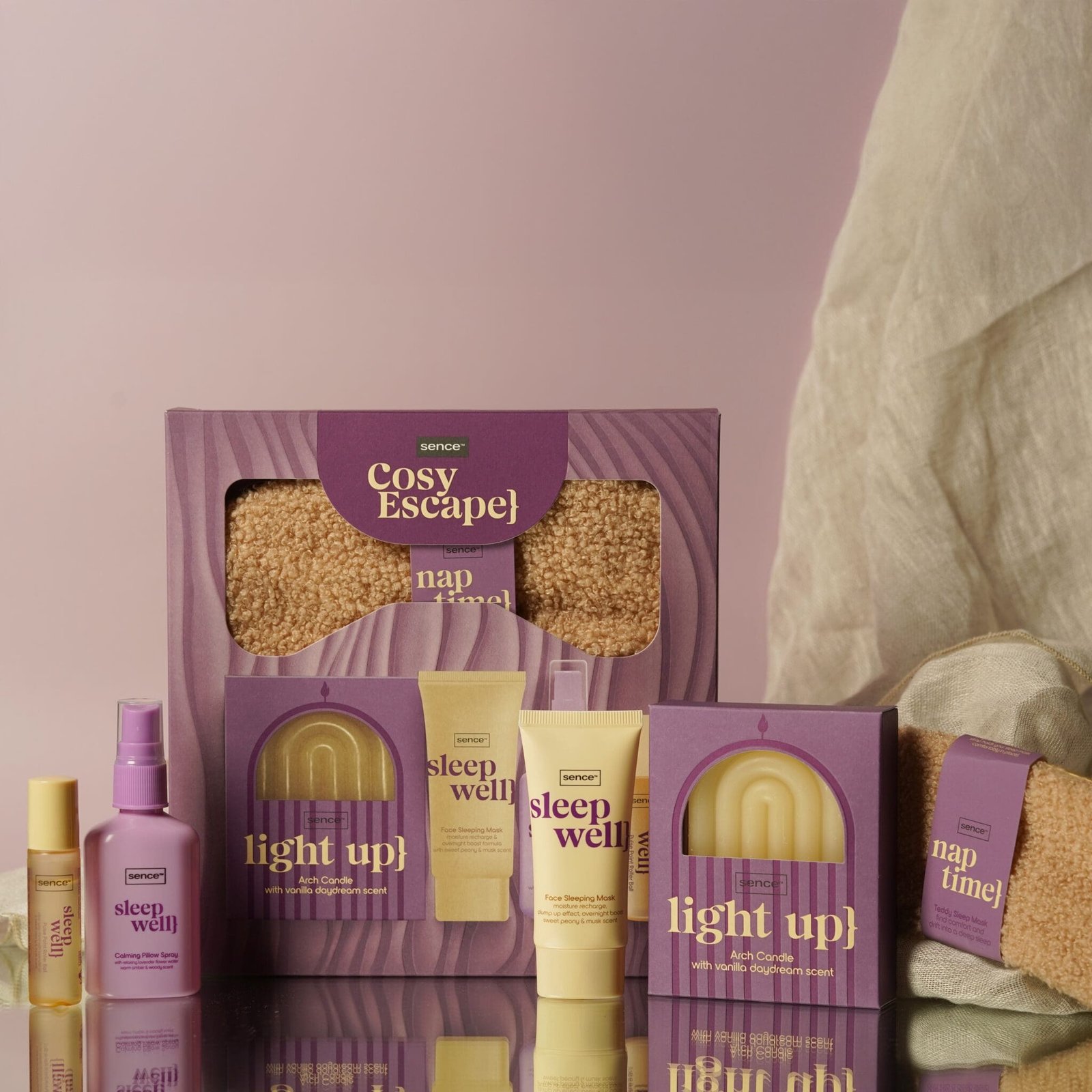 مجموعة كوزي إسكيب” من سينس بيوتي هي مجموعة هدايا مصممة لتعزيز الاسترخاء والنوم الهادئ