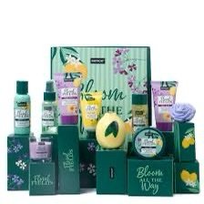 المحتويات: كريم لليدين، زيت جسم لامع، مقشر للجسم، جل استحمام، زبدة للجسم، قفاز تقشير، صابون، رذاذ للجسم، قناع للشعر، شمعة، ومزهرية صغيرة.