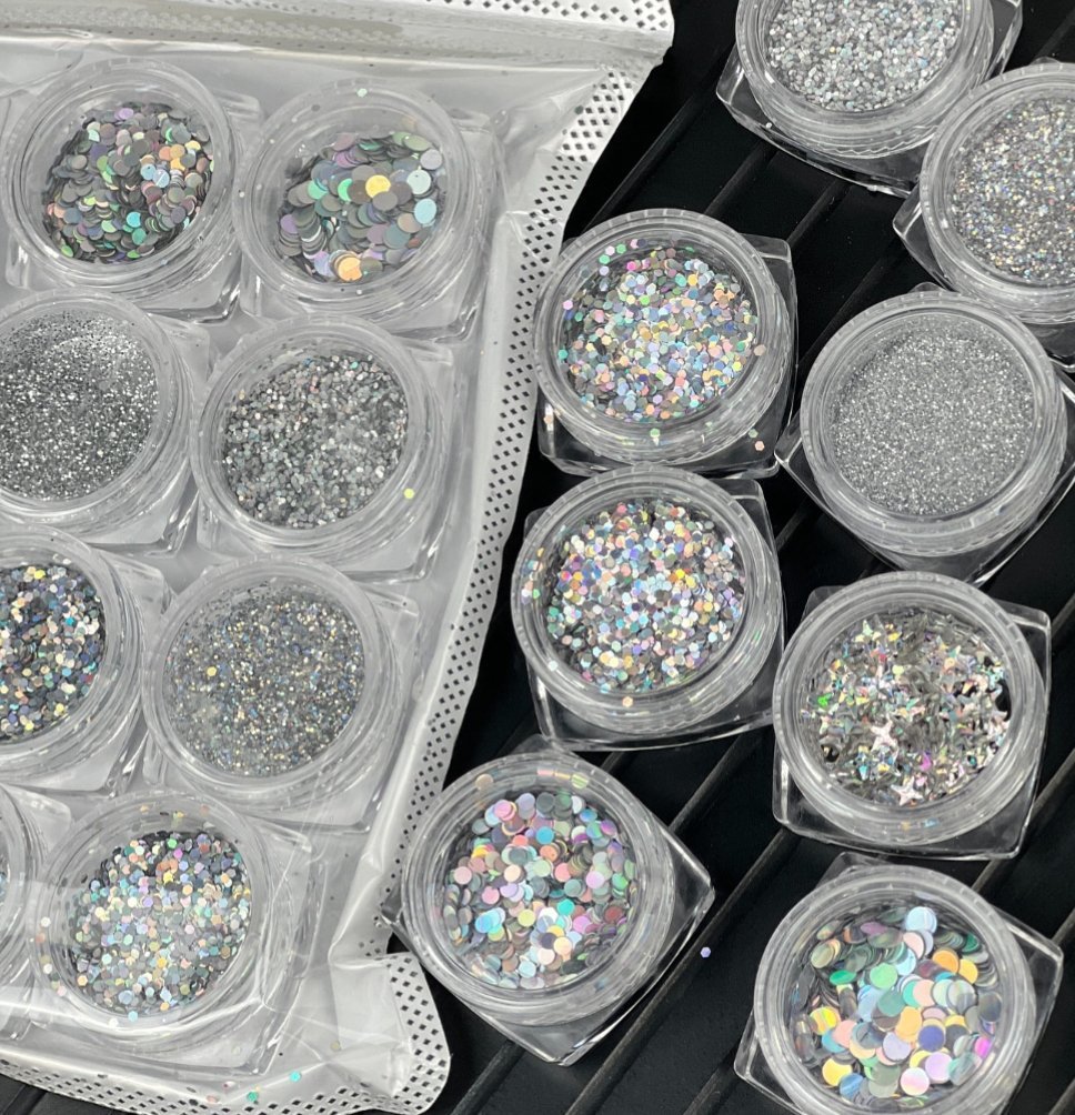 گلتر أظافر ثلاثي الأبعاد (هولوغرافي) بألوان وتأثيرات مختلفة. تُستخدم لتزيين الأظافر وإضافة لمعان.